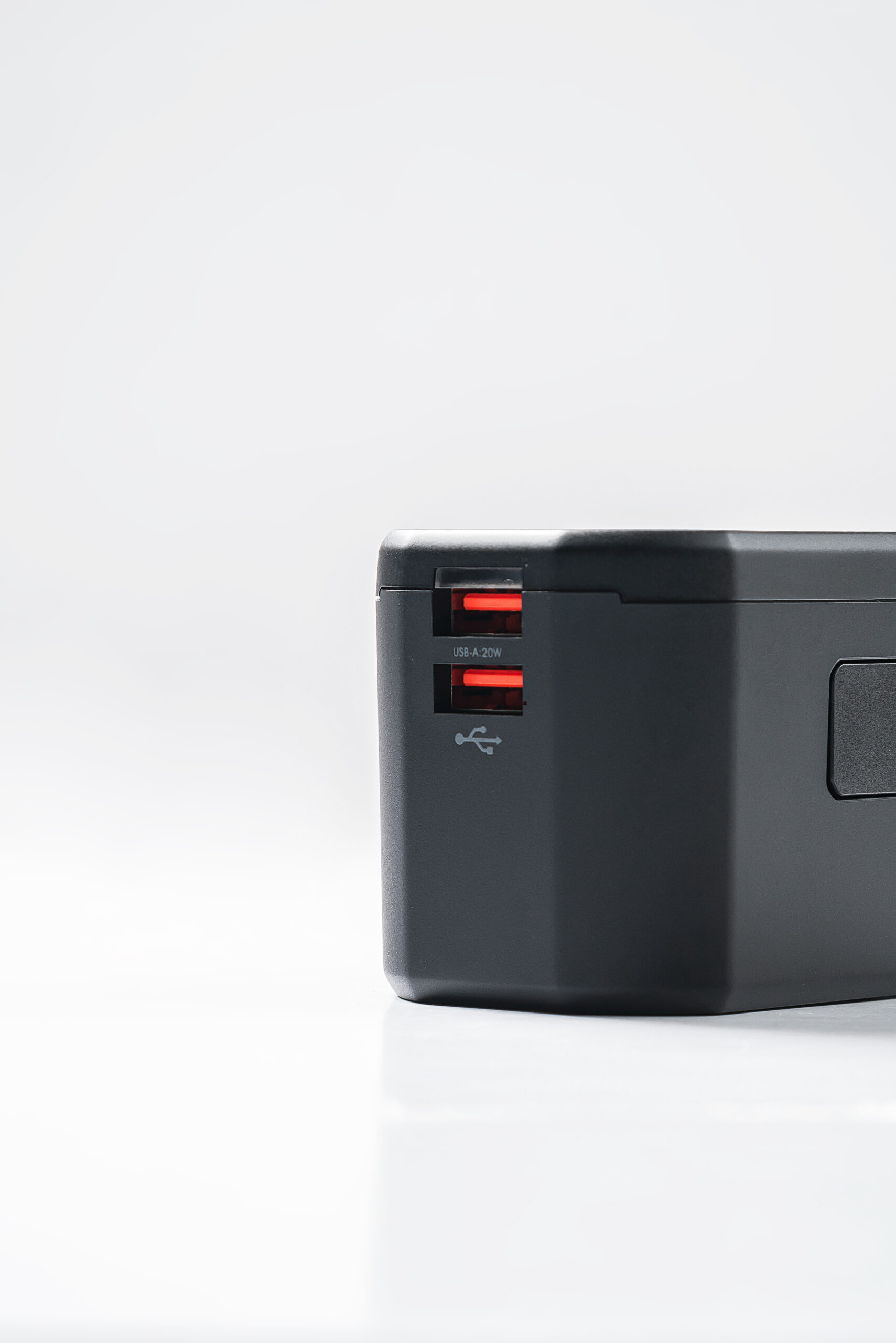 Incluye puerto USB-C (5 V-3 A / 9 V-2.22 A / 12 V-1.67 A) y dos puertos USB-A (5 V-2.4 A cada uno), sumando salida total de hasta 20 W.