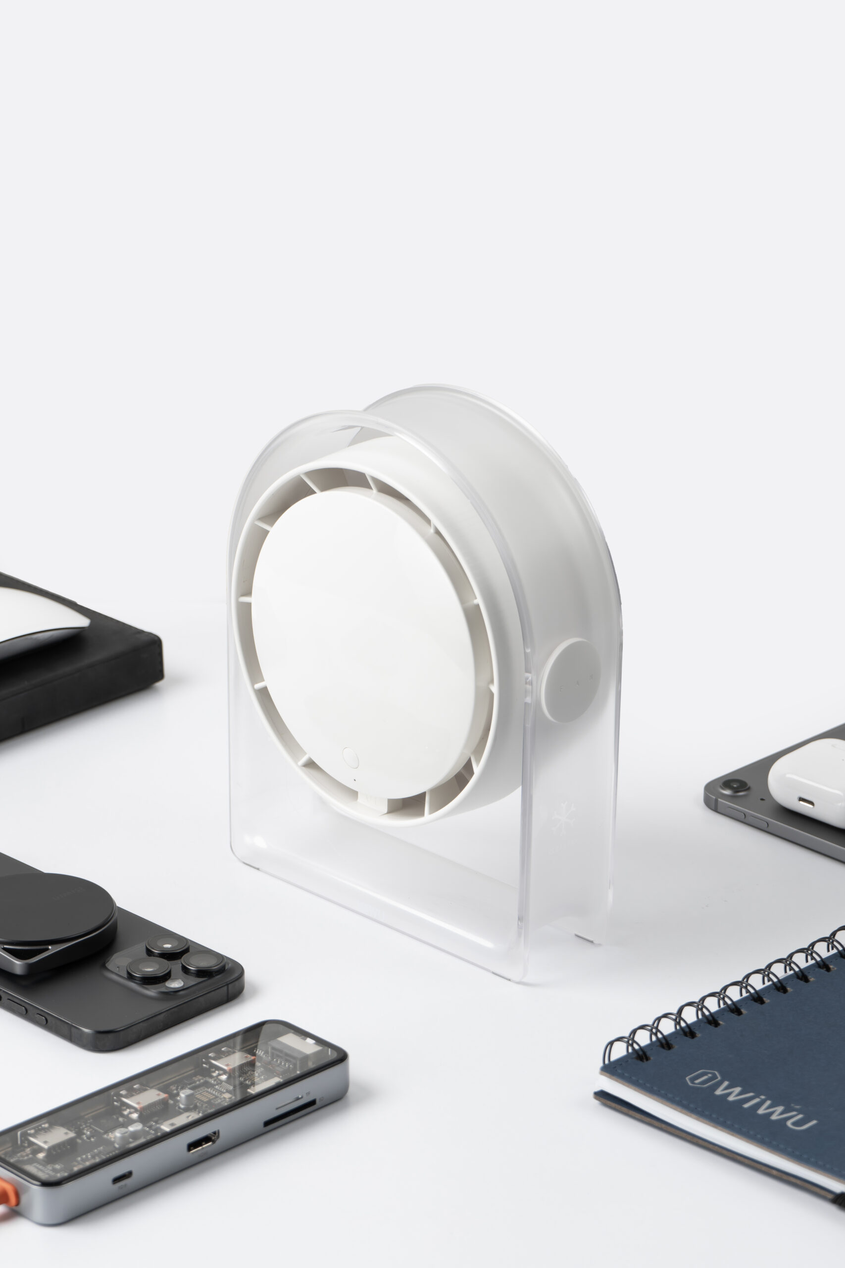 Base tipo stand que permite colocarlo sobre el escritorio con estabilidad y orientar el flujo de aire fácilmente.
